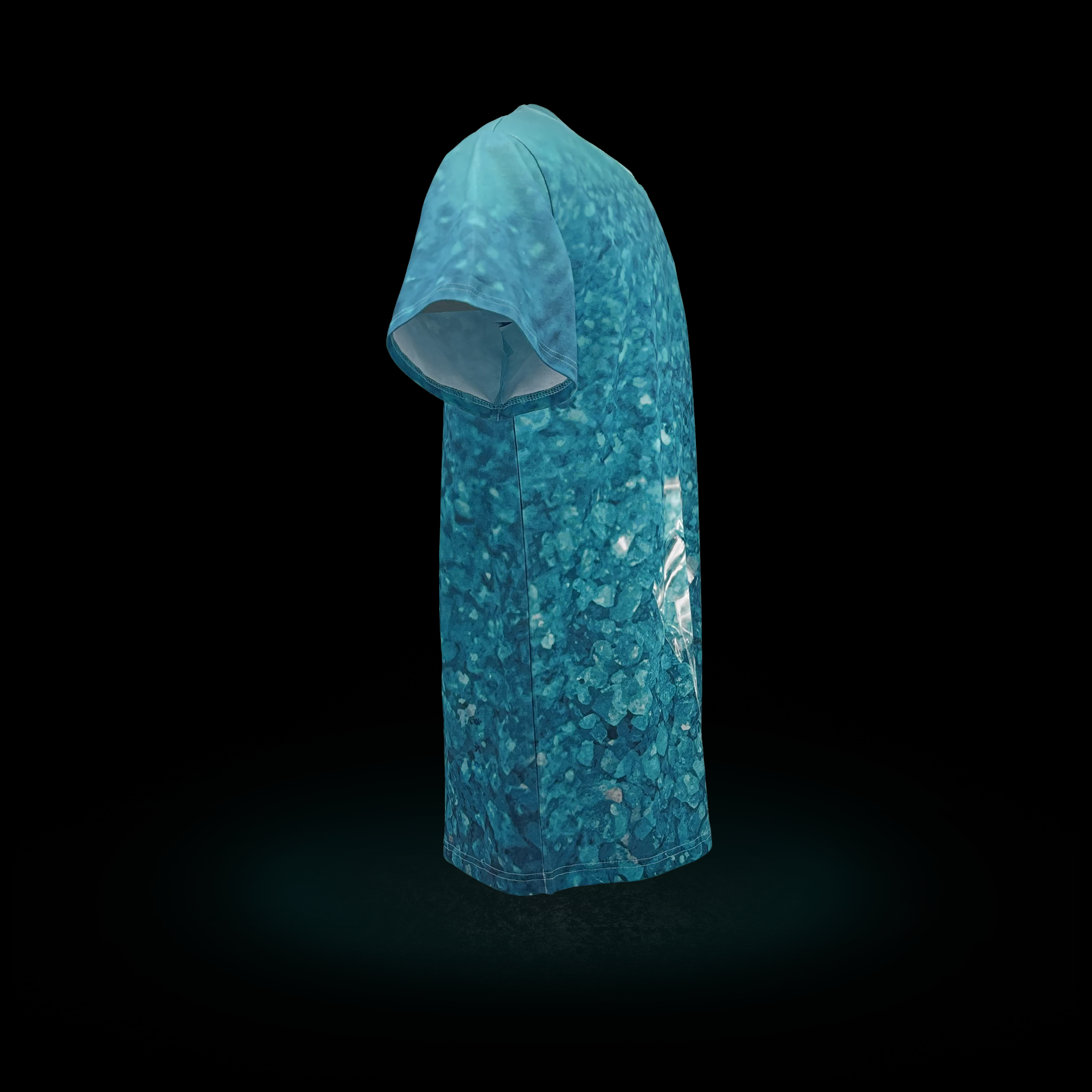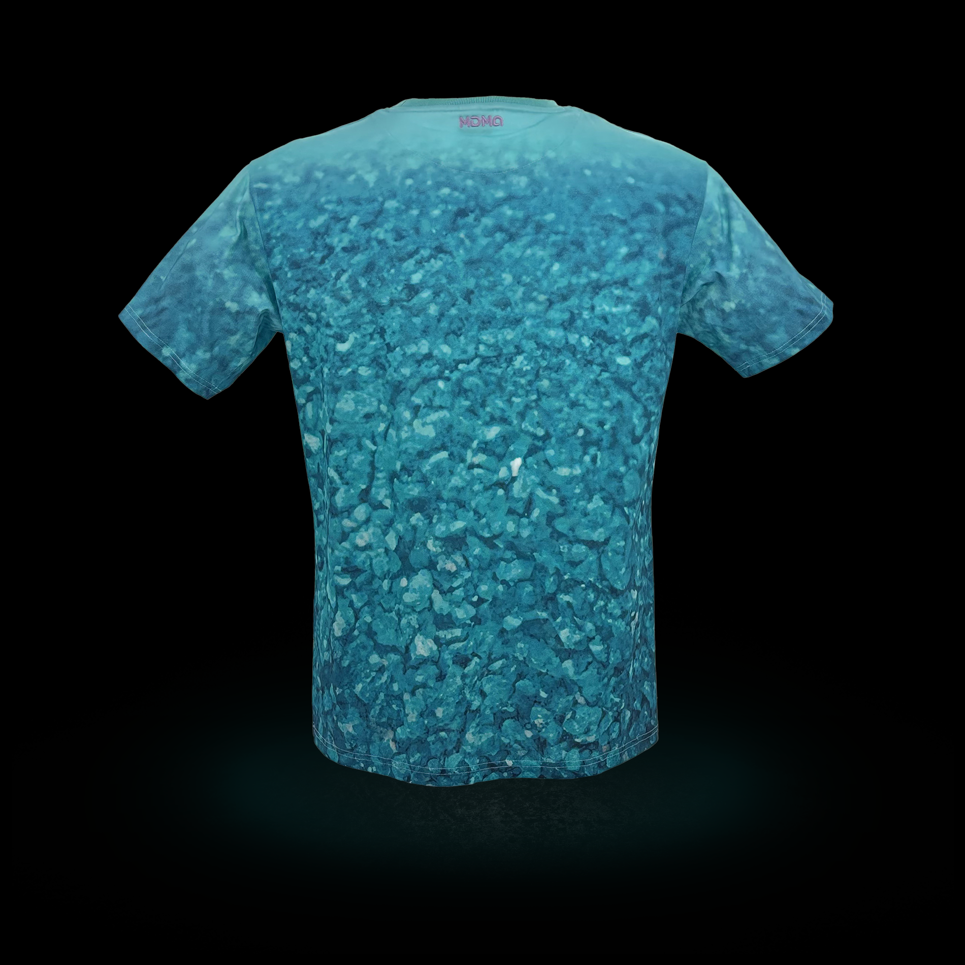 Ein wildes Muster aus blauen Kristallen bedeckt das gesamte Shirt.