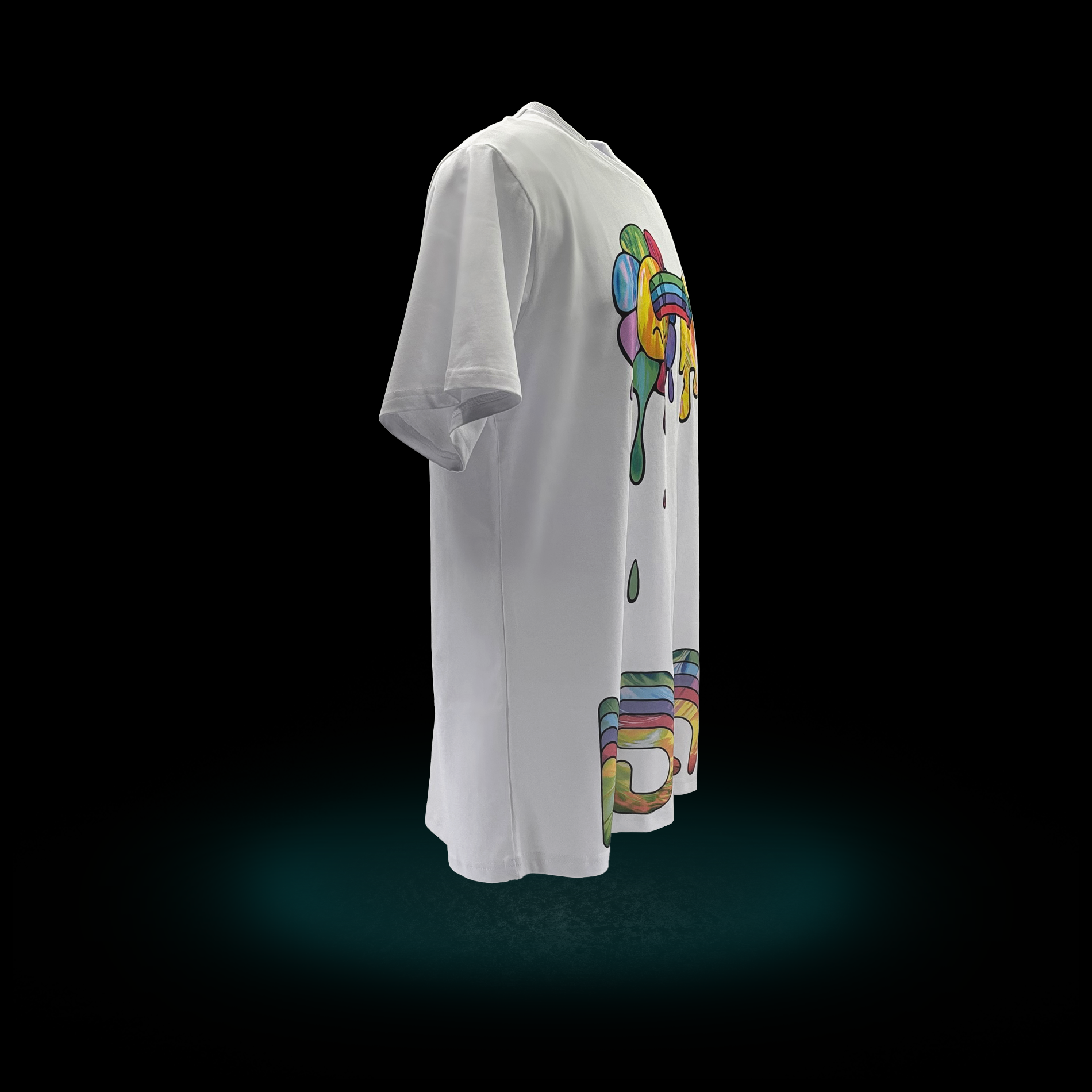 Die Kombination aus auffälligem Print, weißem Stoff und fluoroaktivem Patch am Ärmel macht das Shirt zur tragbaren Ekstase.